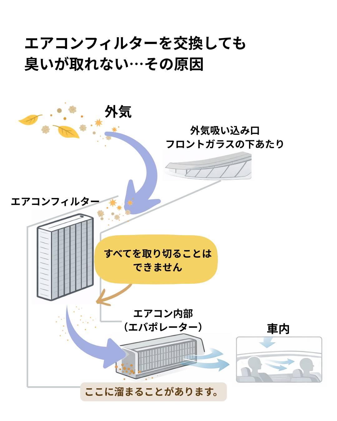 外気導入ではどうしても、排ガス、花粉、ホコリを一旦車内に入れてしまいます。
